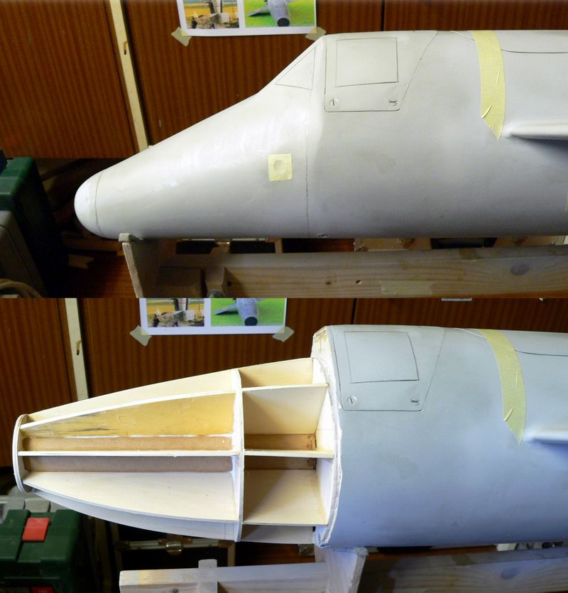 Die Spitze wird vom Kiel aus gesehen um 40mm angehoben und außerdem um 40mm verlängert. Gleichzeitig wird die Spitze nicht mehr kegelförmig sondern eher ogiv werden. Fortsetzung folgt... Folgende Datei wurde angehängt: