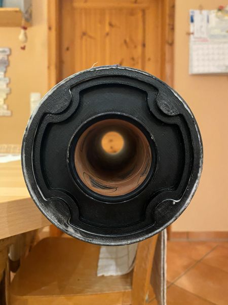 es geht ein kleines Stück weiter: Das 4" PML Rohr für das Innenrohr und das 4" Kupplerrohr konnte ich auf einer Formatkreissäge passend und pikobello winklig ablängen. Und wie der Zufall es so wollte. habe ich in einem Restekarton von mir noch ein 44cm langes Stück 54mm PML-Rohr gefunden, aus dem jetzt das 430mm lange Motorrohr wird. So muss mein schönes neues 54er Rohr gar nicht zersägt werden und kann für weitere Projekte ganz bleiben. Ist ja unfassbar, was das Zeuch mittlerweile kostet.... Hier ist das Innenleben mal lose zusammengesteckt. So soll das ganze Konstrukt später im Körperrohr sitzen. Aber am Stück geht das da nicht rein, jeder Ring möchte einzeln eingeklebt werden. Von daher geht das ab jetzt alles nur schrittweise und langsam, da jede einzelne Klebung in der warmen Küche übernachten möchte. Als erstes wird mit Hilfe von JB Weld temperaturfestem 2K Kleber aus meinem Motorrohr und dem Retainer ein Stück. Danach wird der Schubspant über das Motorrohr gesteckt und direkt auf dem Retainer aufliegend verklebt. Motorrohr mit Schubspant werden dann als ein Stück in die GFK Hülle eingesetzt, mit dem ersten Ring zentriert und verklebt. Sieht leider nicht so sauber aus, wie ich das gerne gehabt hätte, da die Harzpampe hierzu mit einem an einem Stab angebrachtem Löffel in den Tiefen des Körperrohrs appliziert wird. Egal, viel hilft viel. So sieht dann irgendwann mal das "Business End" aus Zweiter Ring aus 4mm Birke Dritter Ring aus 6mm Multiplex, hier endet das Motorrohr und beginnt das 4" Innenrohr Auf dem Ring eine Aufdoppelung aus 4mm Sperrholz als Zentrierung für das Innenrohr und als Verstärkung für den Aufhängepunkt der Schockleine. Unterhalb und oberhalb, (deswegen schaut das Motorrohr etwas durch den Spant hindurch) sind kurze Stützringe aus Phenolrohr aufgeklebt. Ich habe schon wesentlich massivere Aufhängepunkte gebaut, aber da war das Gewicht der Zelle auch drei, viermal höher. Das wird halten. Zwischen den Ringen müssen jeweils auch die Halter für die Railbuttons eingeklebt werden, da sonst die Ringe nicht mehr daran vorbei passen. Dazu habe ich M4 Gewindemuffen in einen Halter aus zwei Lagen Sperrholz eingeklebt und die so vorbereiteten Platten mit ordentlich angedicktem Harz und Glasmatte eingeklebt. Mit einer Schraube und einer Hülse wird der Halter in Position gehalten bis das Harz fest ist. Soweit Jan Geändert von Kabelmann am 19. Dezember 2025 um 23:17 |